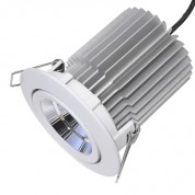 Deckeneinbauleuchte mit richtbarem Spotkopf 35°, Gehäuse aus robustem Alu-Druckguss, Jordan-Spiegelreflektor, kurze Bügelfedern, mit vorverkabeltem (externen) 1050 mA DC-Konverter, dimmbare Version (1-10V analog) auf Anfrage erhältlich. Masse: Leuchte Ø 82 mm | Einbau-Ø 68 mm | Einbautiefe mind. 90 mm Modul: High Power LED 13 W | 1050 mA | 32° | 930 lm | 3000 K | dimmbar (a.A.)